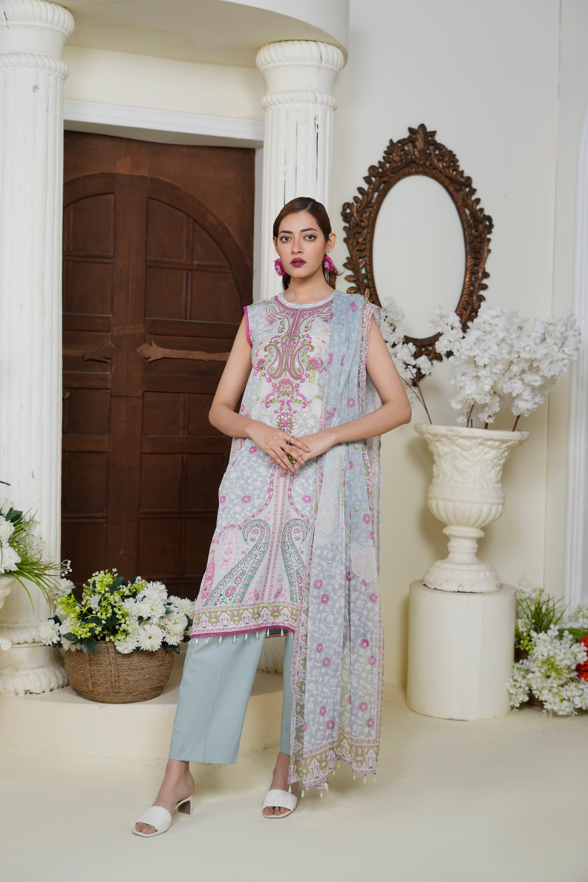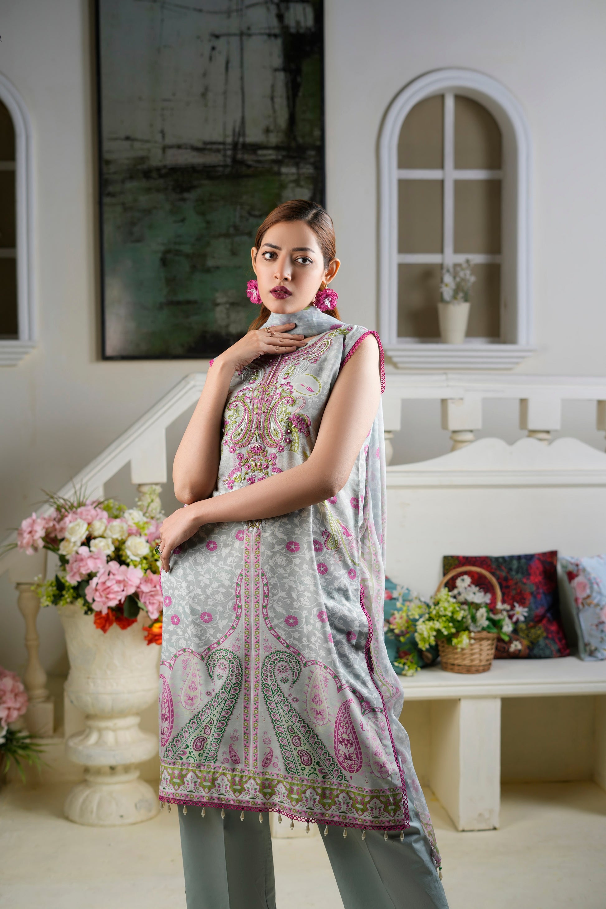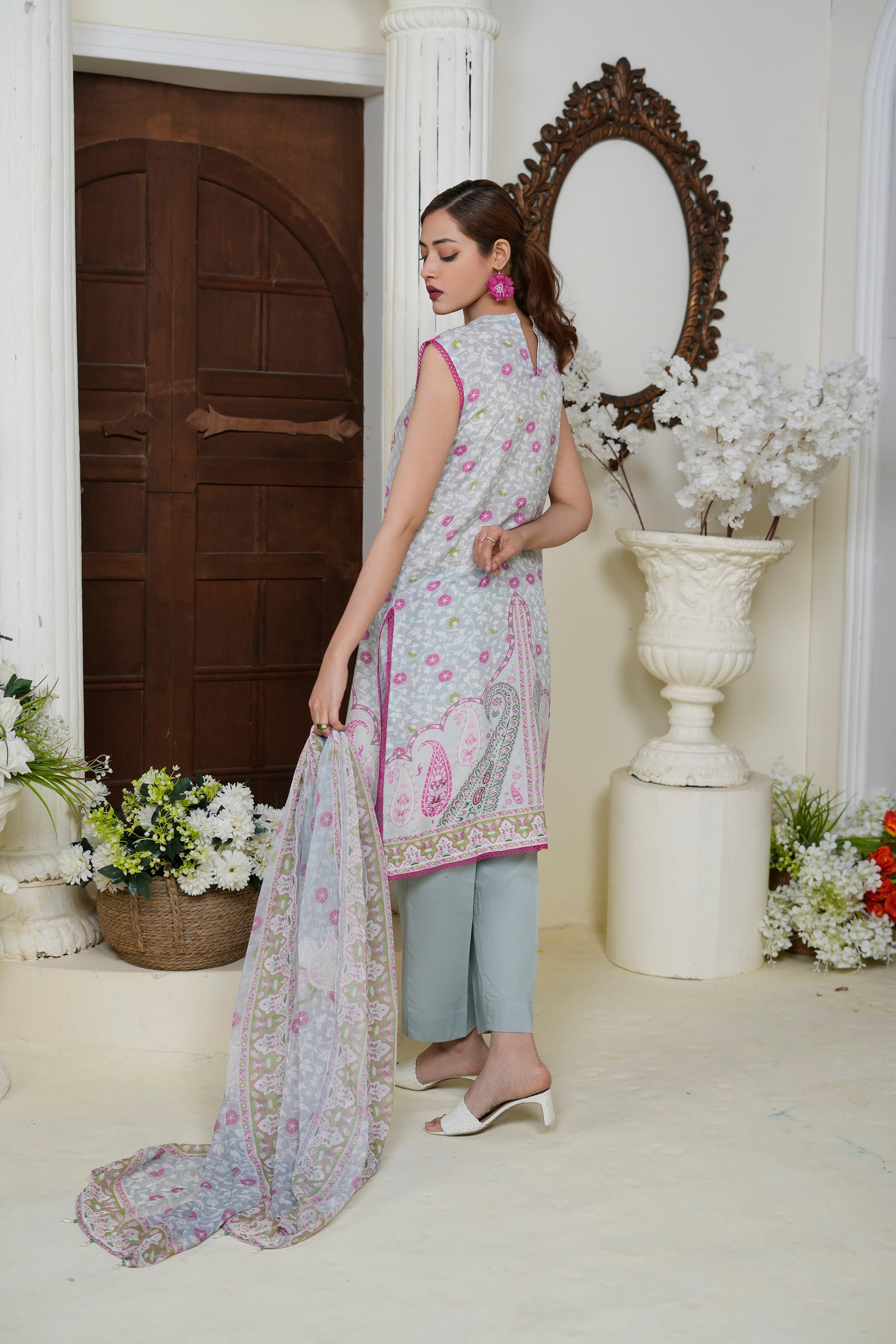 The Cotton Lawn Shop presents a stylish and versatile 3-piece cotton floral unstitched salwar suit dupatta set for women. With a beautiful printed design and delicate embroidered lace detailing, this dress material is perfect for any occasion. The soft cotton fabric ensures comfort and durability. Upgrade your wardrobe with this elegant grey ensemble.